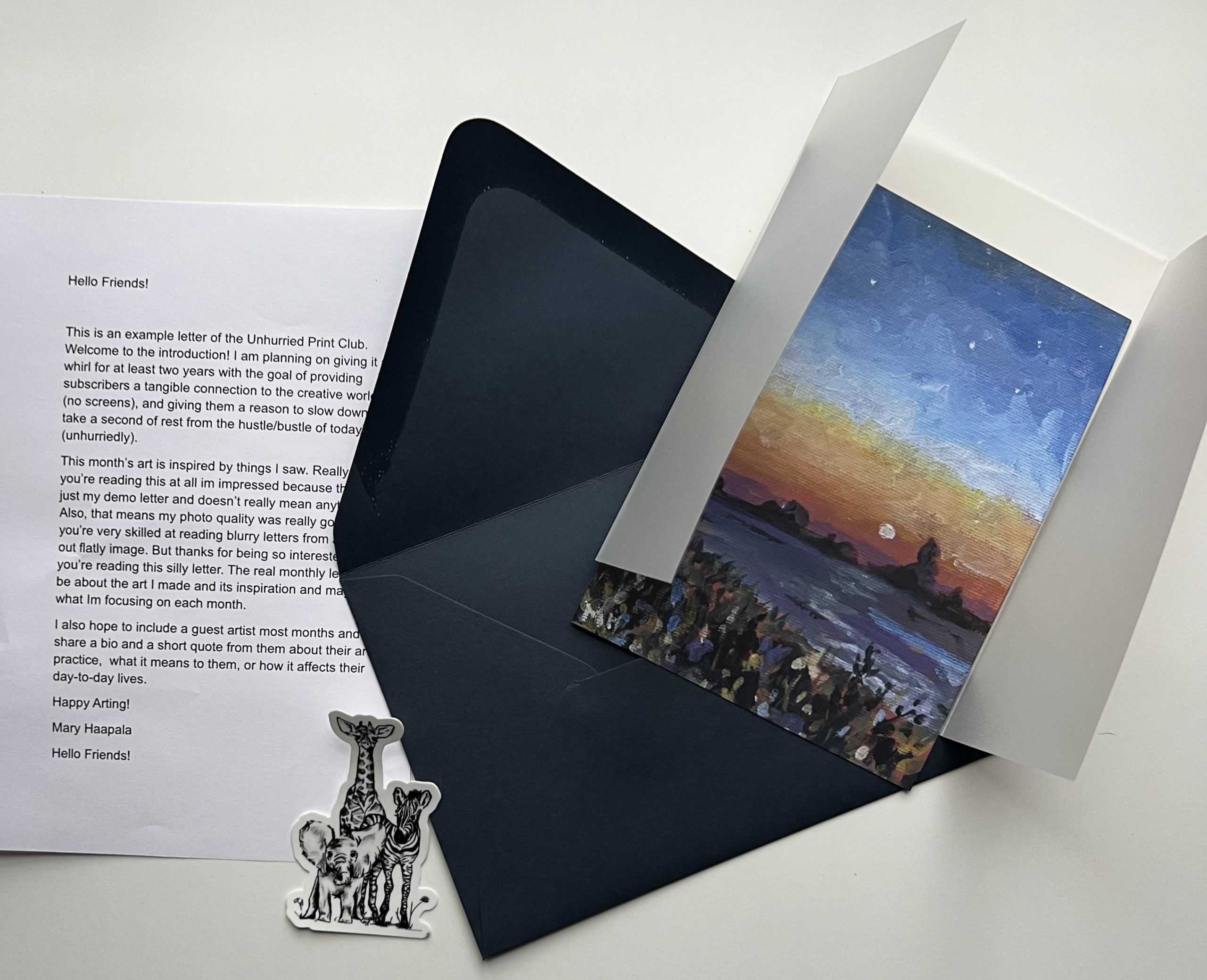 Unhurried Print Club is a subscription based service with options to receive an envelope either once a month or once every-other month. Every envelope will contain a never-seen-before archival-quality art print of original art by me, Mary Haapala. The prints will always be 5×7 (vertical orientation) so that you never have to change your display method in your home (for display and framing ideas, see this post here). It will also include a small letter detailing the inspiration behind the piece and an extra small product in each envelope. The extra product will usually be a postcard (so you can spread some snail mail love to others) or potentially a sticker, bookmark or mini-print created by myself or a guest artist.